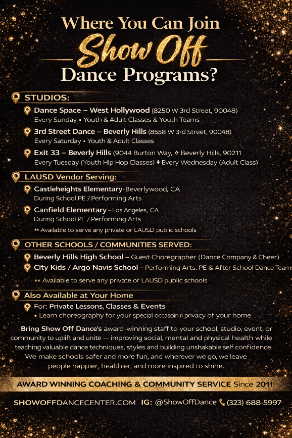 We partner with public and private schools as a certified LAUSD vendor, offering after-school enrichment, physical education initiatives, performing arts electives, assemblies, special events and entertainment. We are thrilled to share that Show Off Dance is also partnered with the Regional Centers and healthcare providers to service special needs and dance therapy clientele. If you're interested in bringing our program to your school site, your place of business or even your home through these resources, we'd love to hear from you.