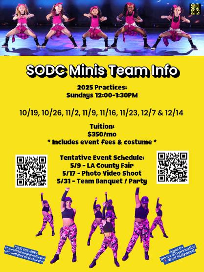 Who -- SODC Teams are for all level dancers, elementary - high school with significant class-taking experience who want to take their training and performance to the next level. We recommend signing up for a GROUP CLASS or PRIVATE LESSONS if interested in joining a team. Students can then build friendships and get to know their coaches and choreographers. Dancers are then placed on a team based on grade, experience and performance level.