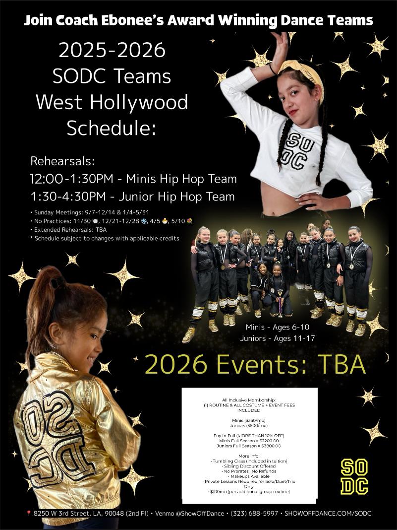 Thank you for your interest in joining SODC -- our dance company and competitive team program. We have a program, team or crew for dancers elementary, junior and high school age, beginners to advanced, and training and choreography of various styles. All teams are directed by Coach Ebonee Arielle and choreographed by our elite team of instructors. SIGN UPS ARE OPEN for the NEW team season every fall. Commitment from fall through spring is required. Send us a message or REGISTER ONLINE to learn more and see if our dance family may be a good fit for you. Are you ready to Show Off?